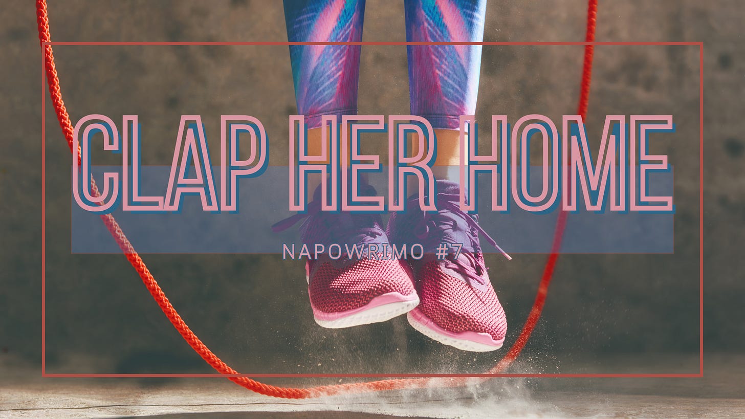 Wet chalk, rain boot, kick can, spin, forsythia yellow paper-thin. Screen door, cat scratch, where you been? April hollered, let her in. One rope turns, one jumps in. Count to seven, count to ten. Clap-CLAP-clap her home again.