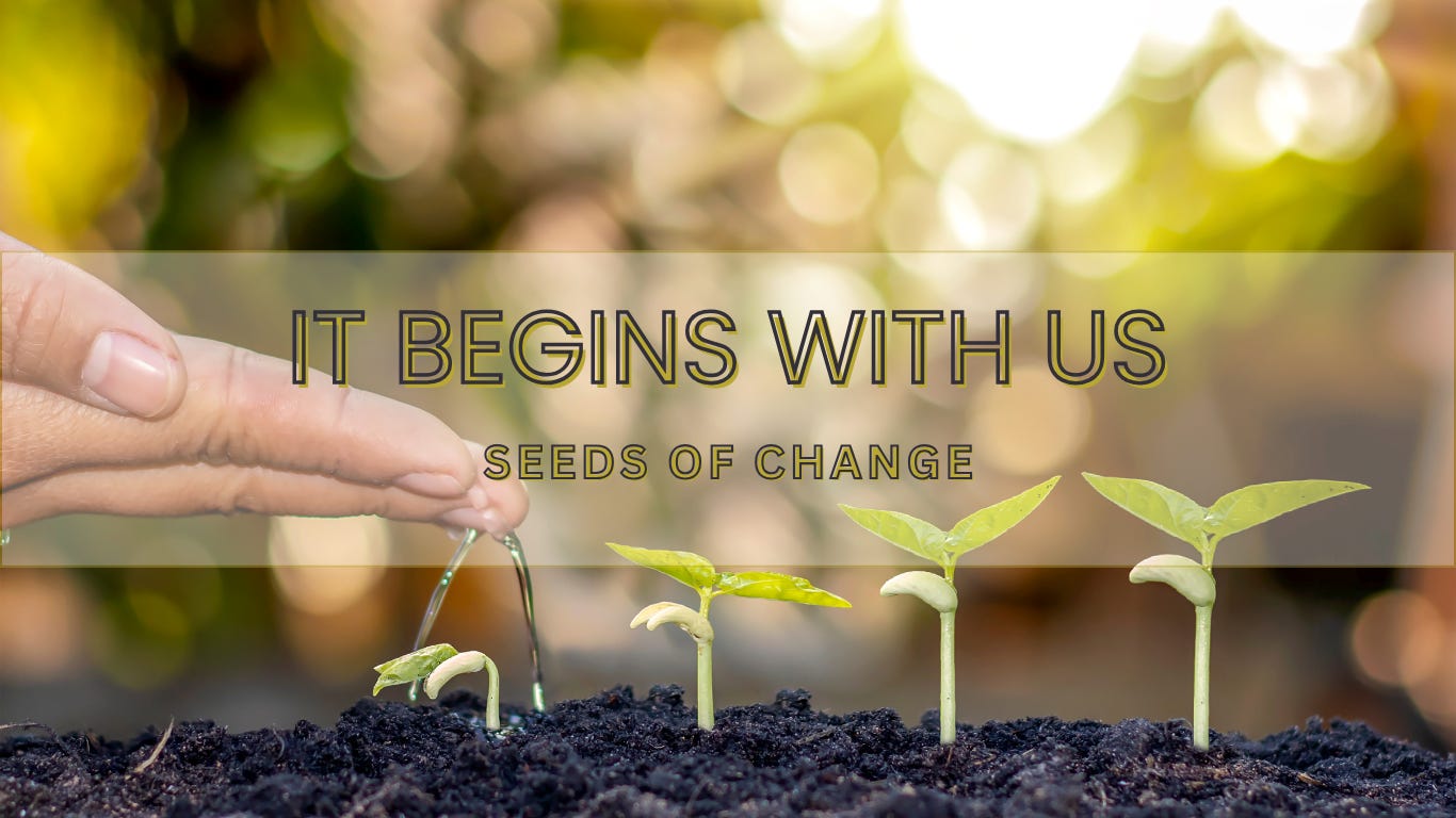 Within the quiet corners of our minds, where thoughts settle like dust particles dancing in the sunlight, we find the seed of change— small and unassuming, yet powerful enough to reshape the world. It begins with a whisper to soul search, rummage through the clutter of our days— the worries and regrets— finding soft spaces where kindness can grow, wildflowers bursting through cracks of concrete. Hands that once grasped tightly, clenching against uncertainty, now open, reaching out, finding the warmth of connection— the shared laughter of neighbors, or quiet nods of understanding in the grocery store aisles, where life happens in every day. As we tend this inner garden, the work we put into it r i p p l e s o u t w a r d; (a smile to a stranger, a helper of those in trouble, an ear that hears without judgment) sparking small fires of hope that become lights for others. So let us begin here— with the faint hum of our hearts, molding a world that isn't just ours, but a collective embrace, where every act of love holds the power to transform, one heart at a time.